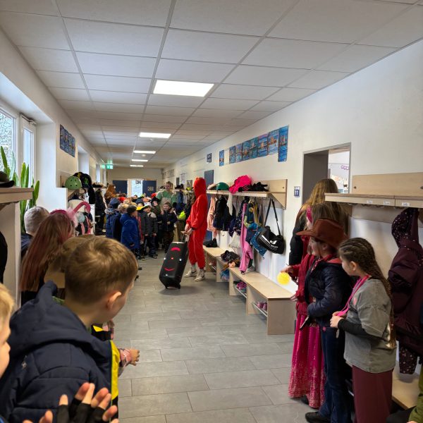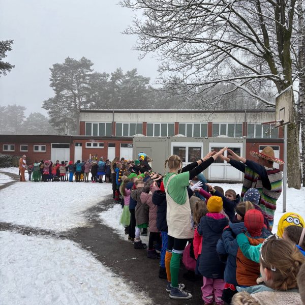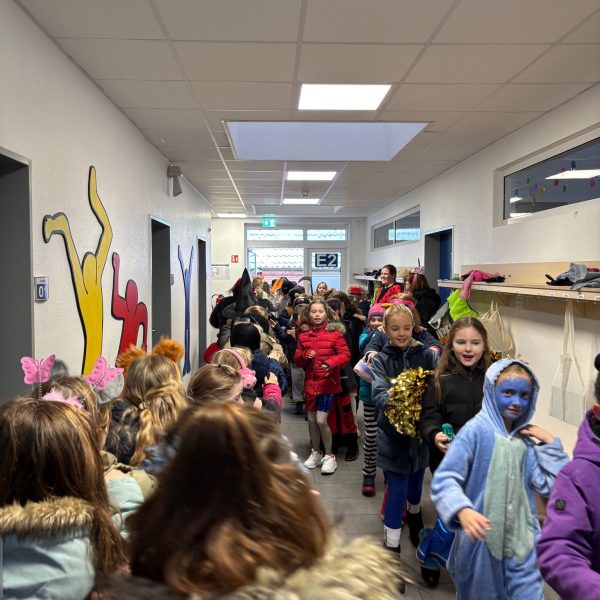 Zunächst wurde in den einzelnen Klassen ausgelassen gefeiert, gespielt, getanzt und ausgiebig gefrühstückt. Danach folgte in der dritten Stunde eine große gemeinsame Polonaise. Der Musik folgend zog eine lange Schlange an Kindern und Lehrkräften durch das gesamt Schulgebäude und über den Schulhof. Dabei wurde mitgesungen, geklatscht und viel gelacht.